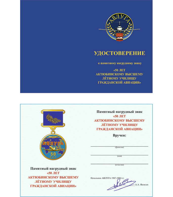 Удостоверение к нагрудному знаку «50 лет АВЛУГА»