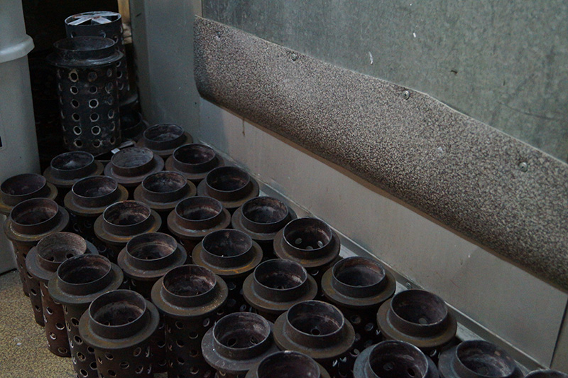 Заполненные металлом опоки поступают в печи, где подвергаются процессу тепловой обработке. Затем опоки охлаждаются и металлические ёлки промываются гидропушкой.