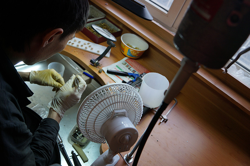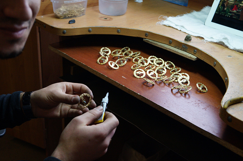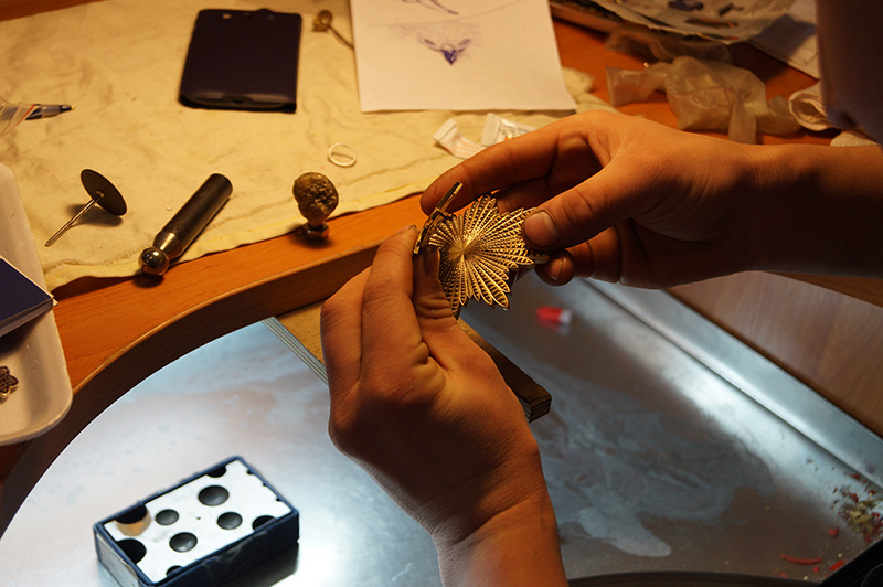 После обработки, детали при необходимости покрывают эмалью. Эмальор разводит двухкомпонентную эмаль и с помощью специальных инструментов вручную заполняет рельеф, вырезанный в металле.